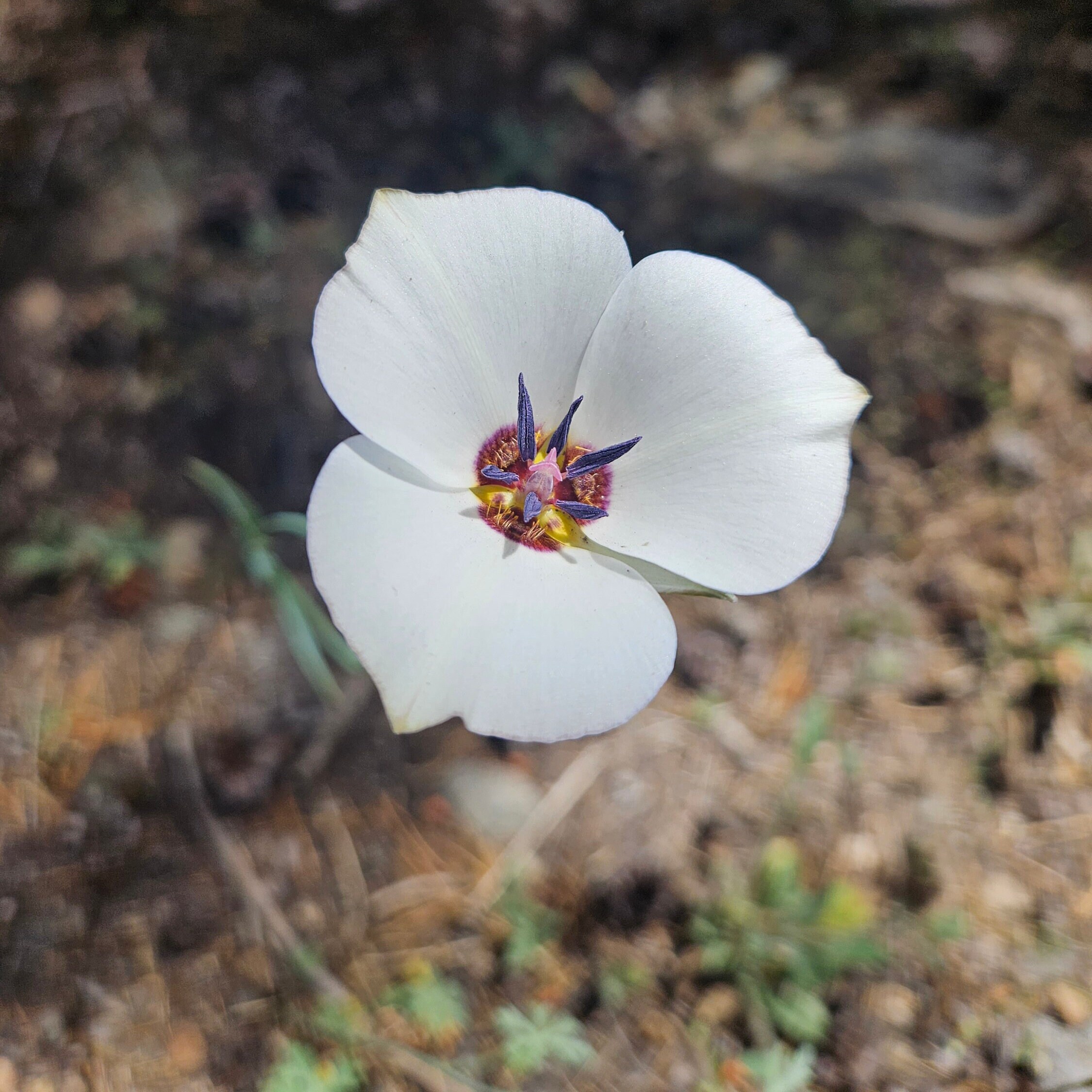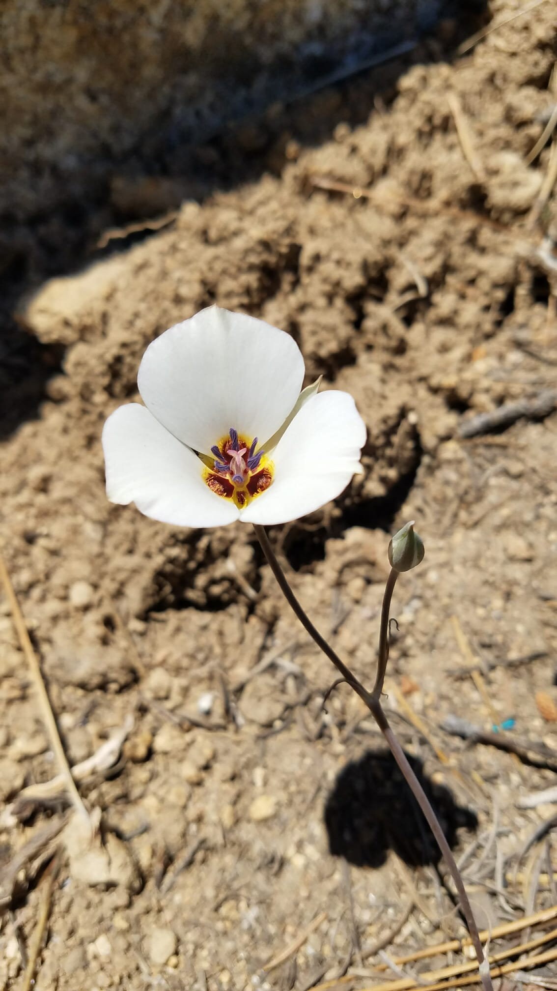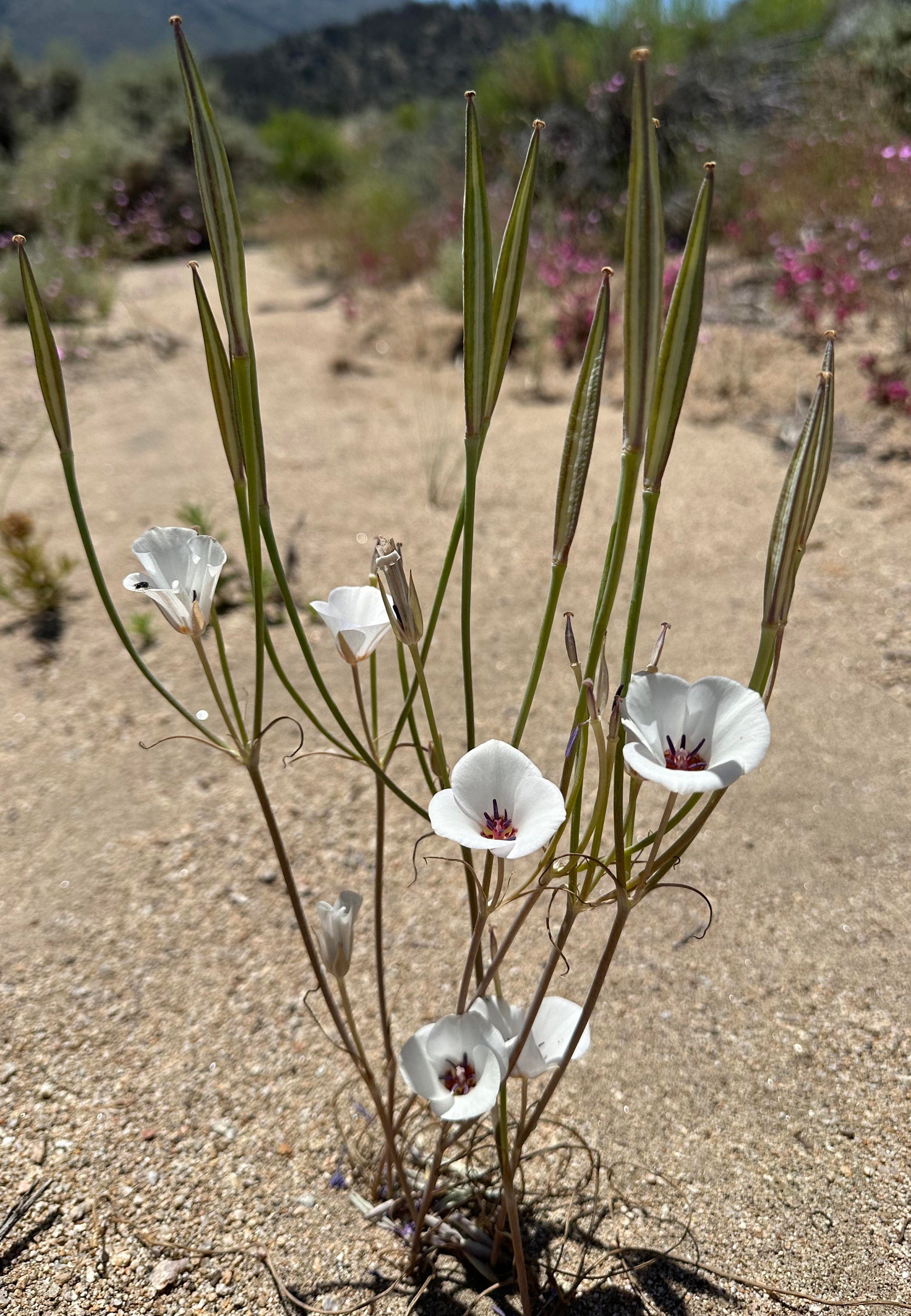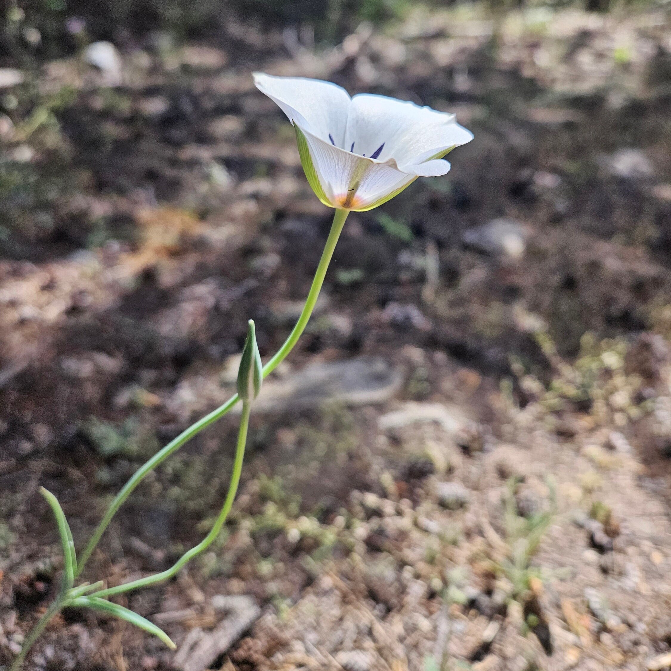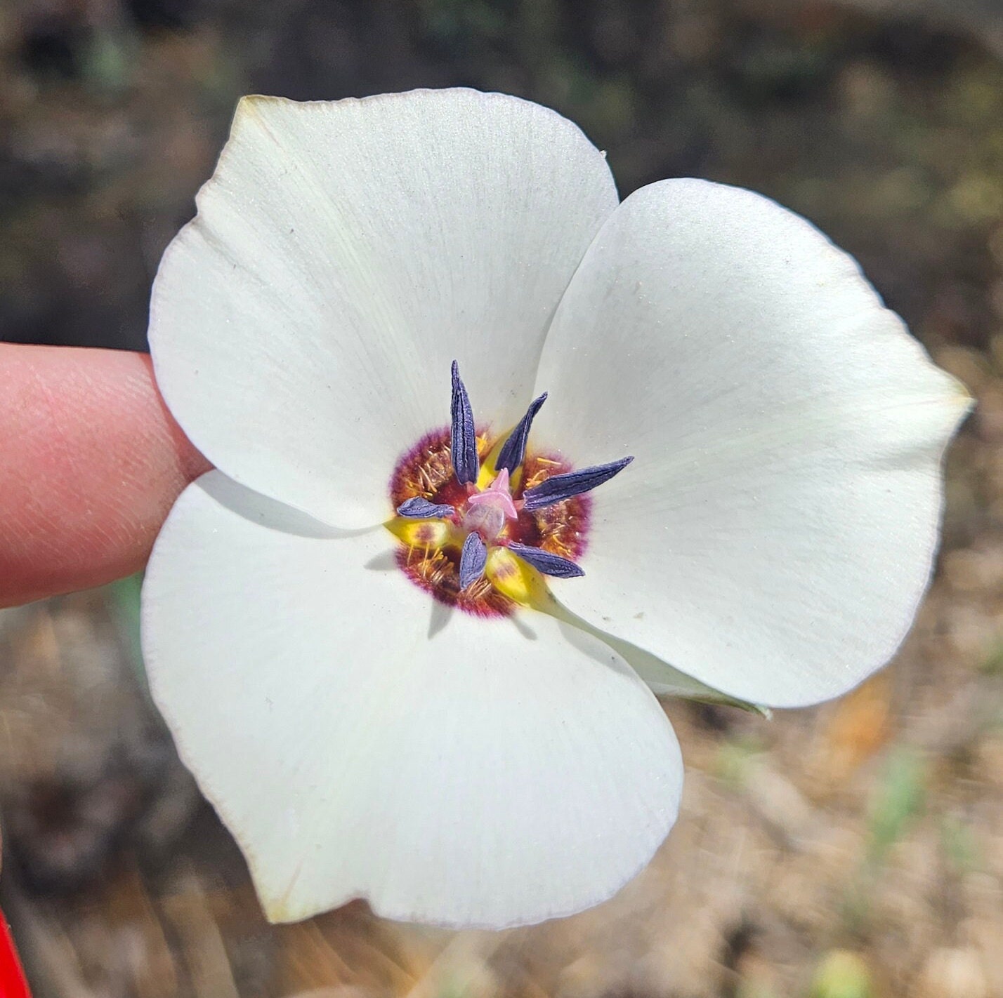 Calochortus bruneaunis is a species of flowering plant in the lily family which is known by the common name Bruneau mariposa lily. It is native to the western United States from California to Montana, where it generally grows in dry, brushy areas. This is a perennial herb producing a mostly unbranching stem up to 40 centimeters tall. The leaf at the base of the stem is narrow in shape, reaching 10 to 20 centimeters long and withering away at flowering. The flower cluster bears 1 to 4 erect bell-shaped flowers. The pointed sepals and larger, rounded petals are white to lilac-tinted in base color. The sepals are marked with a reddish or greenish spot or streak toward their bases and the petals have a greenish streak on the outer surface and a base of yellow, purple, and red coloration on the inner surface. The fruit is a narrow, angled capsule up to 7 centimeters long. It contains several flat, yellow seeds. Plant in fall. Prefers granitic, rocky/sandy soils and full sun. Moderate water until established. Packet will contain 15 seeds.