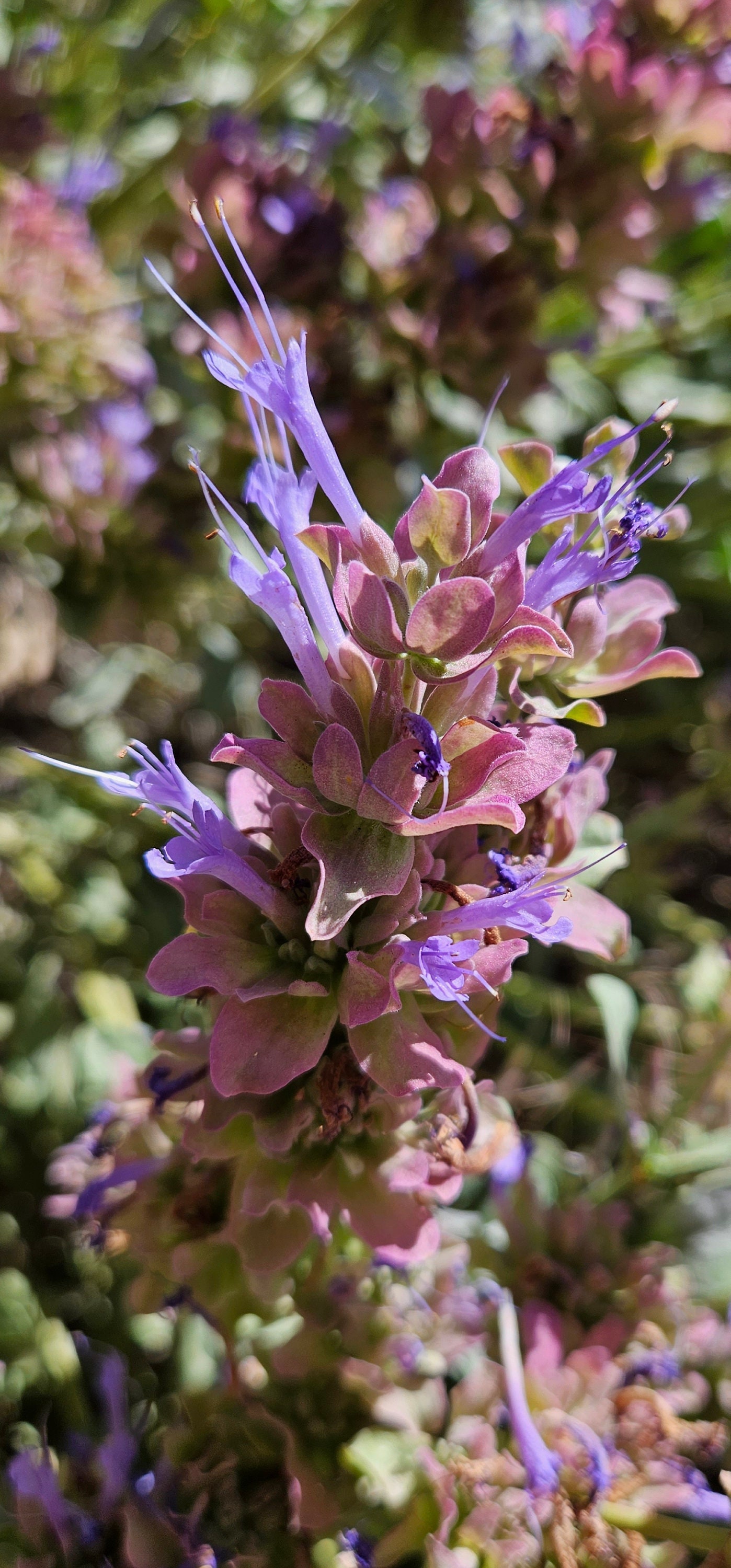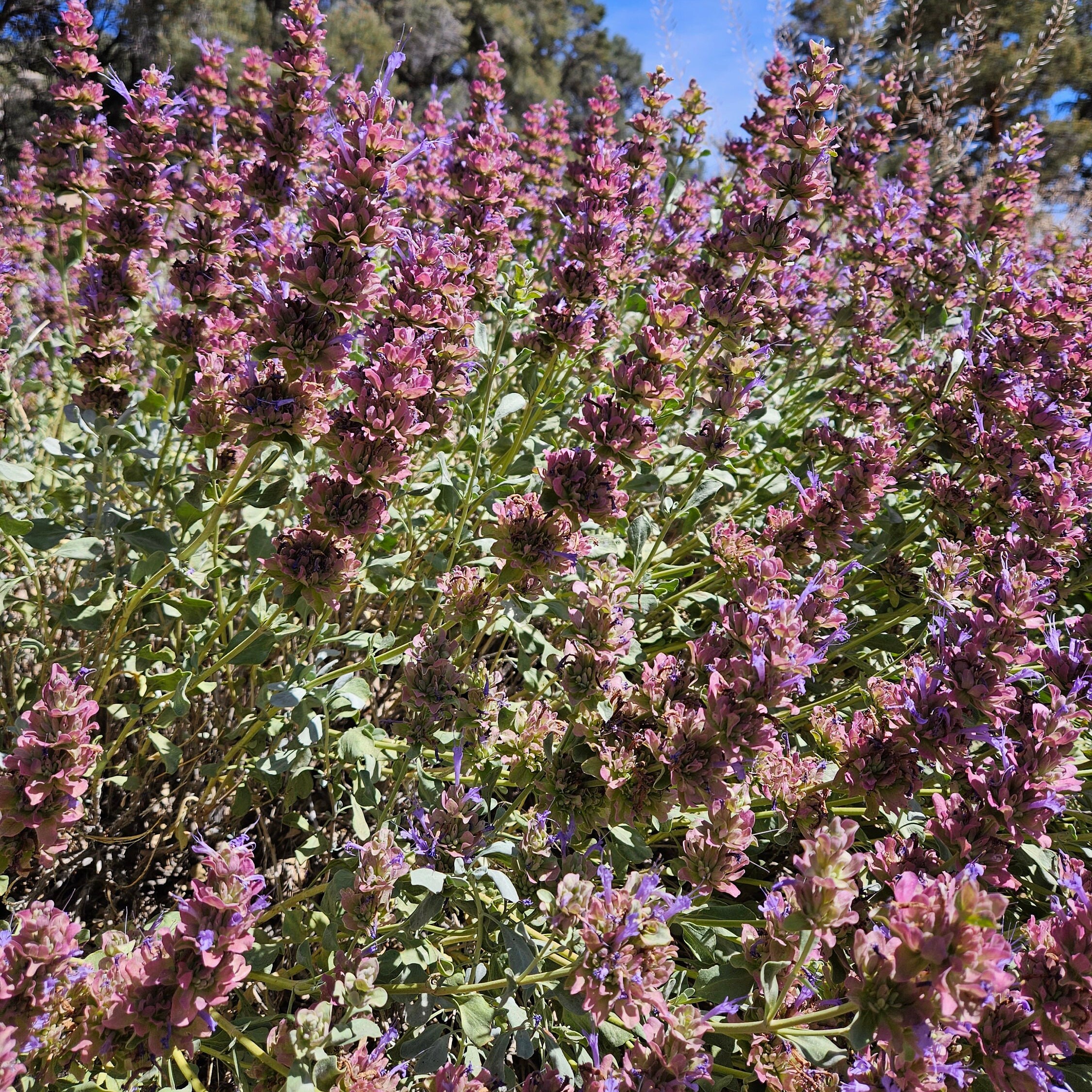 Blue sage is a long-lived evergreen shrub. This species combines many nice attributes, including drought tolerance, long bloom period, showy flowers, attractive foliage, and strong aroma. Blue sage is valuable for its ability to add late summer color to the water-conserving garden. The plants are woody and highly branched. The evergreen leaves remain attractive through the winter in the warmer climates of the Intermountain West. In colder areas, the leaves and smaller branches may be damaged by cold and require some pruning in spring. Flowers form on new growth and begin blooming in late June or early July. The small flowers are dark blue, set in a background of prolific red-purple bracts. The plants remain colorful well into September. Blue sage is one of the most vibrant of all Intermountain West native plants.