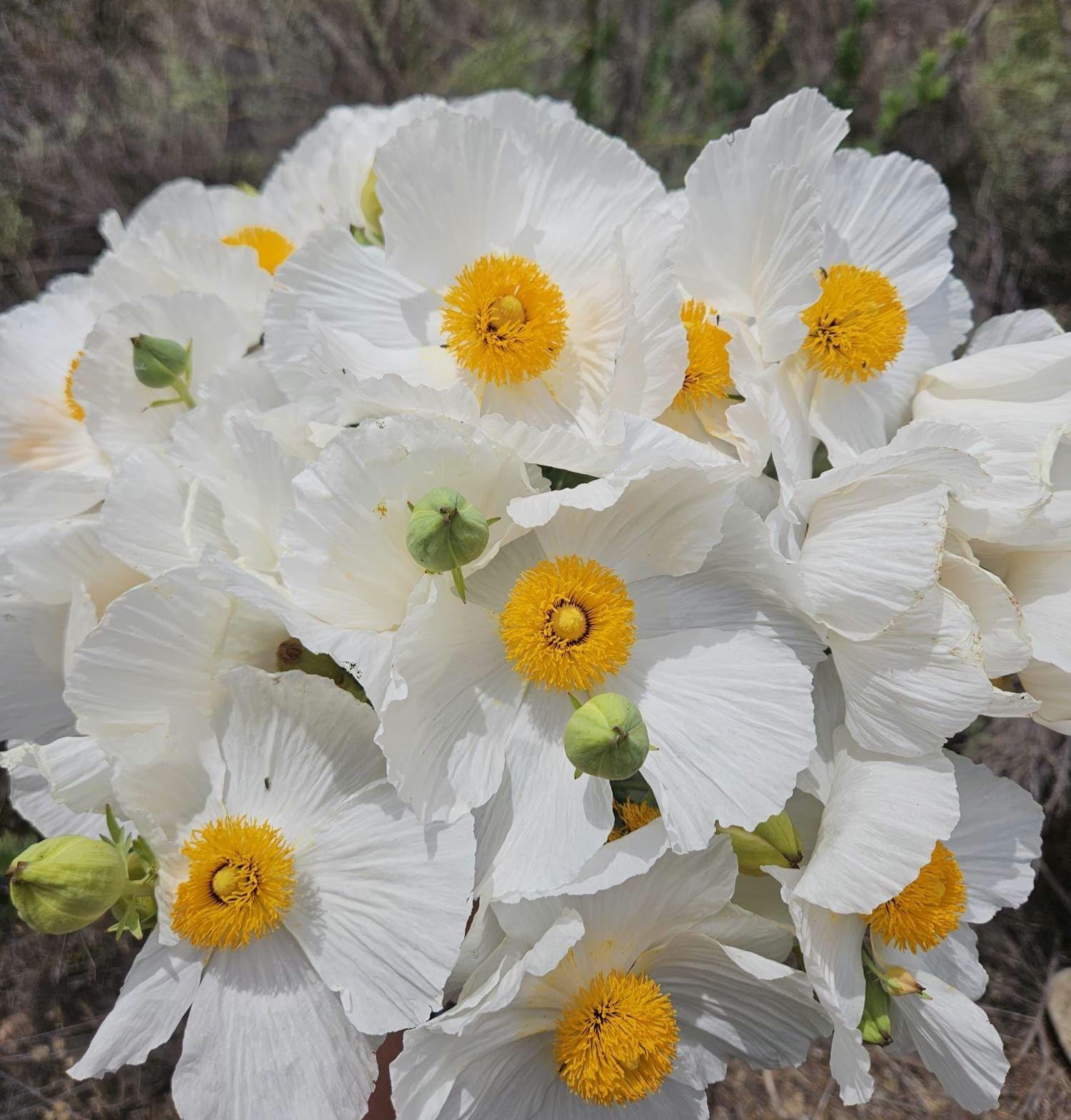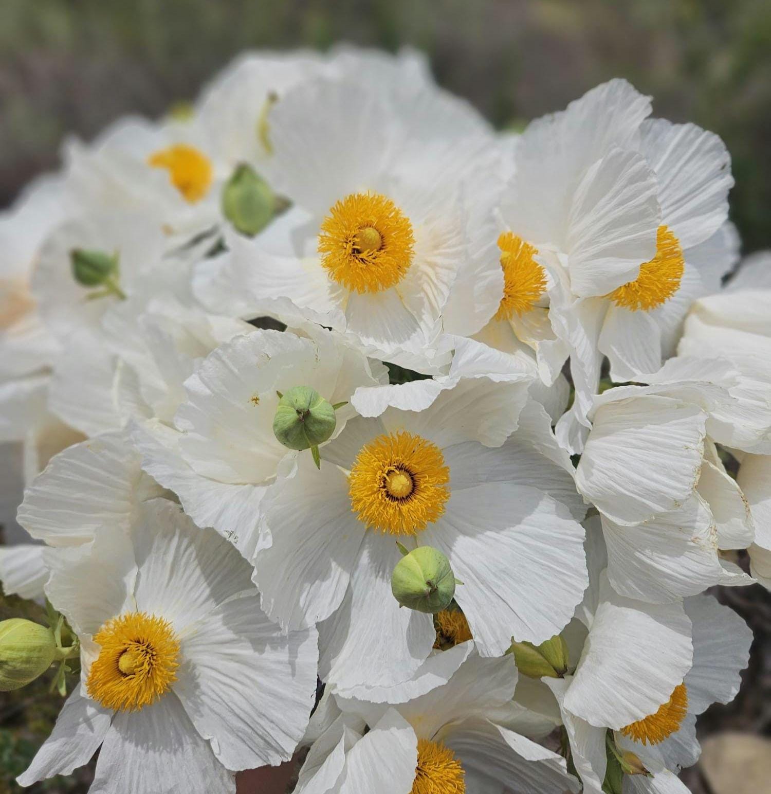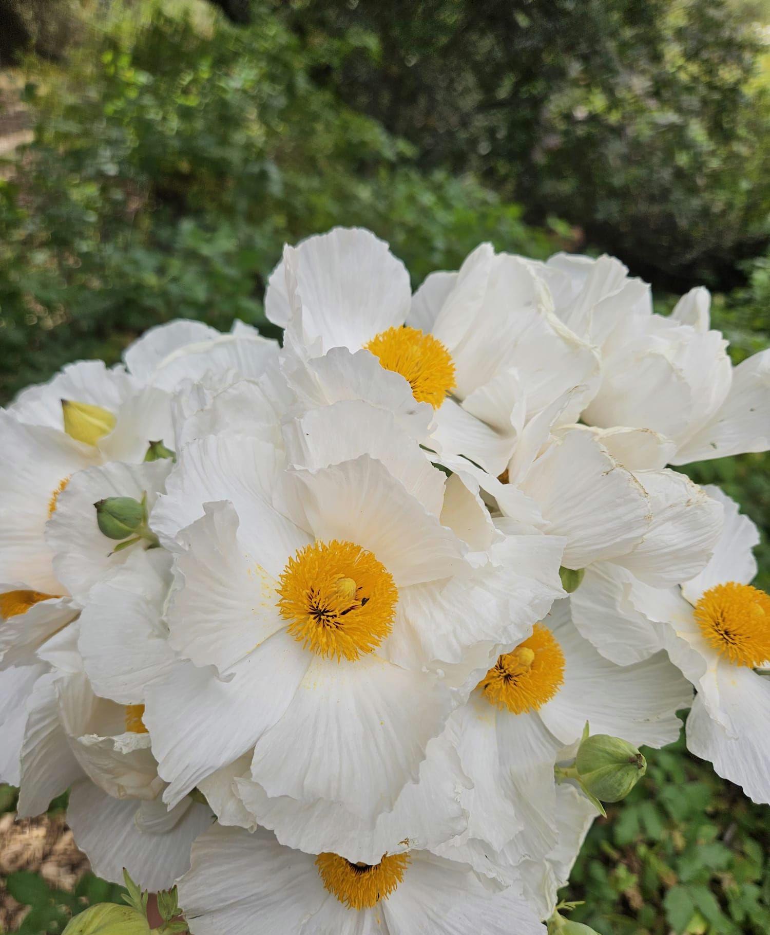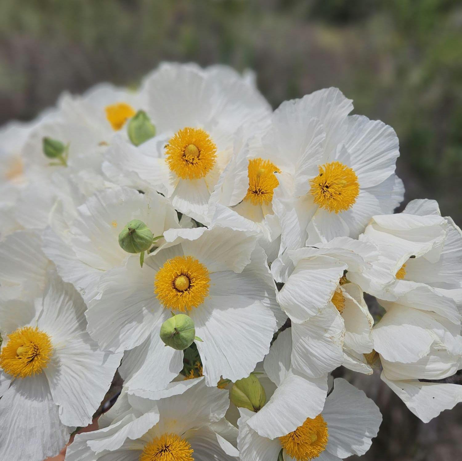About Coulter's Matilija Poppy (Romneya coulteri)Romneya coulteri (Coulter's Matilija poppy) is species of flowering plant in the poppy family. This poppy is native to southern California and Baja California, where it grows in dry canyons in chaparral and coastal sage scrub plant communities, sometimes in areas recently burned.It is a popular ornamental plant, kept for its large, showy flowers. This is a shrub which may exceed two meters in height, its woody stem growing from a network of rhizomes. The gray-green, waxy-textured leaves are each divided into a few lance-shaped lobes, the blades growing up to 20 centimeters long. The inflorescence is a large, solitary flower with six crinkly white petals each up to 10 centimeters long. At the center of the flower is a cluster of many yellow stamens. The fruit is a bristly capsule 3 or 4 centimeters long containing many tiny seeds. This plant bears the largest flowers of any species native to California, rivaled only by Hibiscus lasiocarpos. It was nominated for the honor of California state flower in 1890, but the California poppy won the title in a landslide. A closely related species, Romneya trichocalyx, has more spiny sepals on the flower buds and overall smaller plant and flowers.