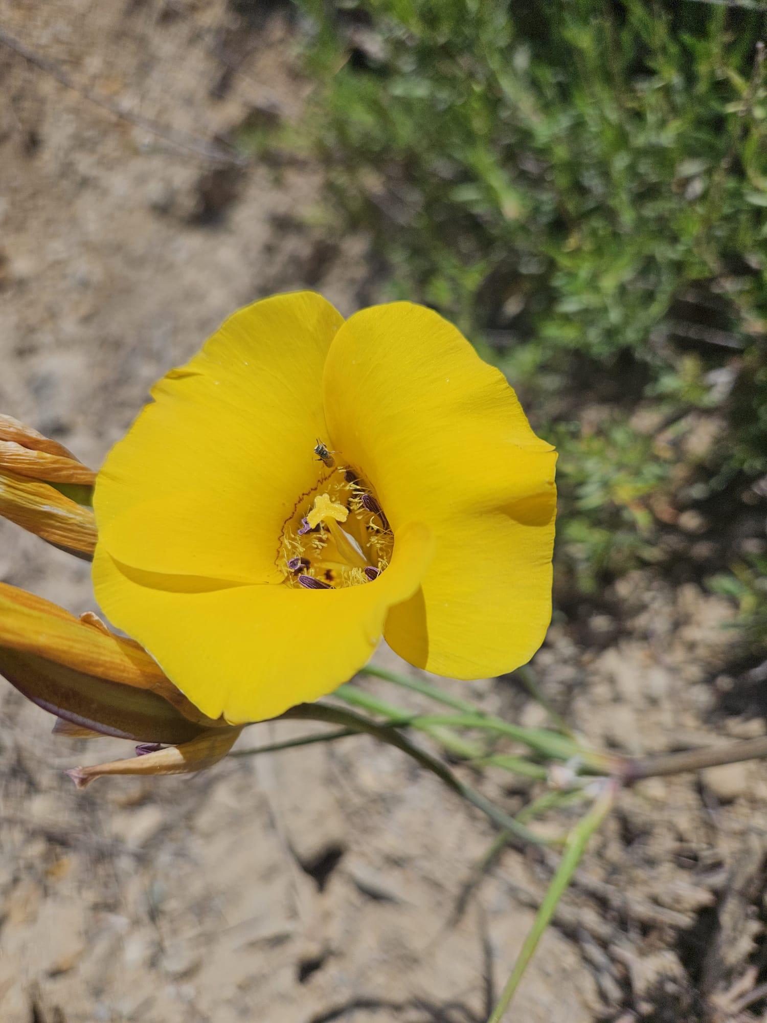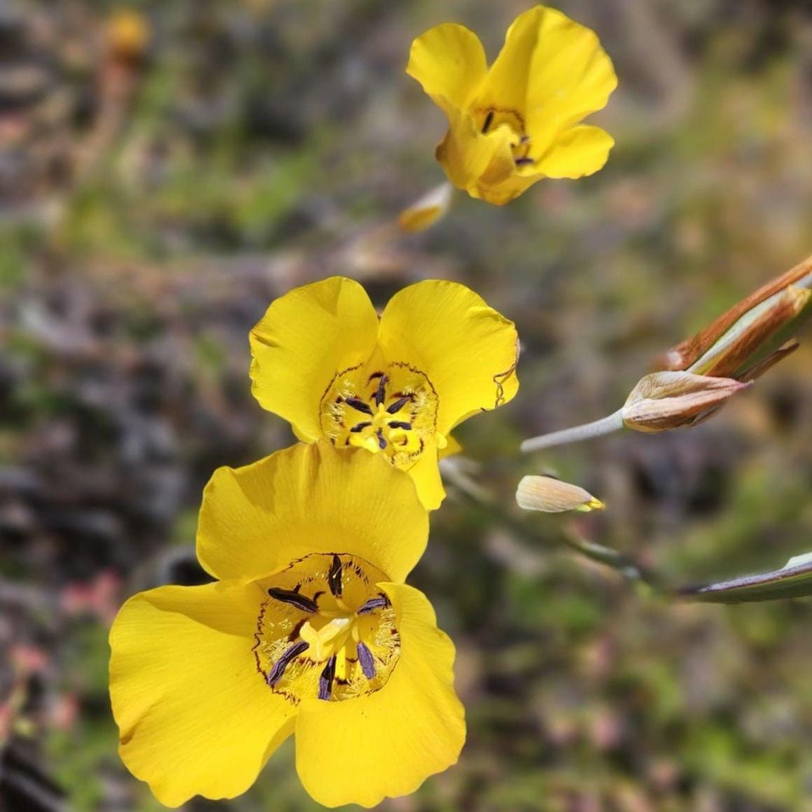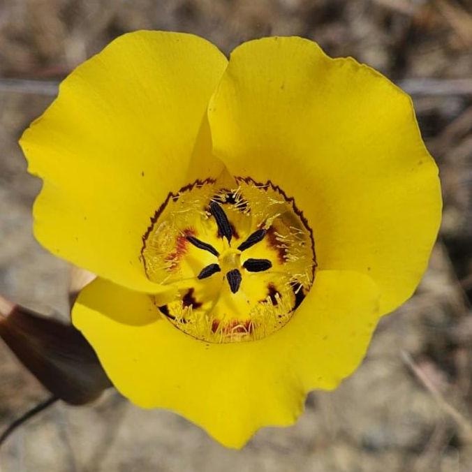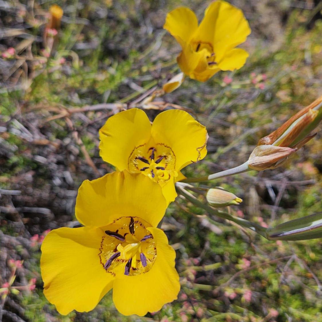 Calochortus clavatus is a species of mariposa lily known by the common name clubhair mariposa lily. It is endemic to California where it is found in forests and on chaparral slopes. This lily produces tall stems up to a meter in height and only basal leaves. Atop the stem is a lily bloom with sepals up to 4 centimeters long. The petals are up to 5 centimeters long and yellow with a darker line or series of bands near the base, which are often red. The cup of the flower is filled with hairs which have clubbed ends. The anthers are often deep purple. The capsule fruit is up to 9 centimeters long.