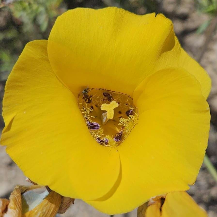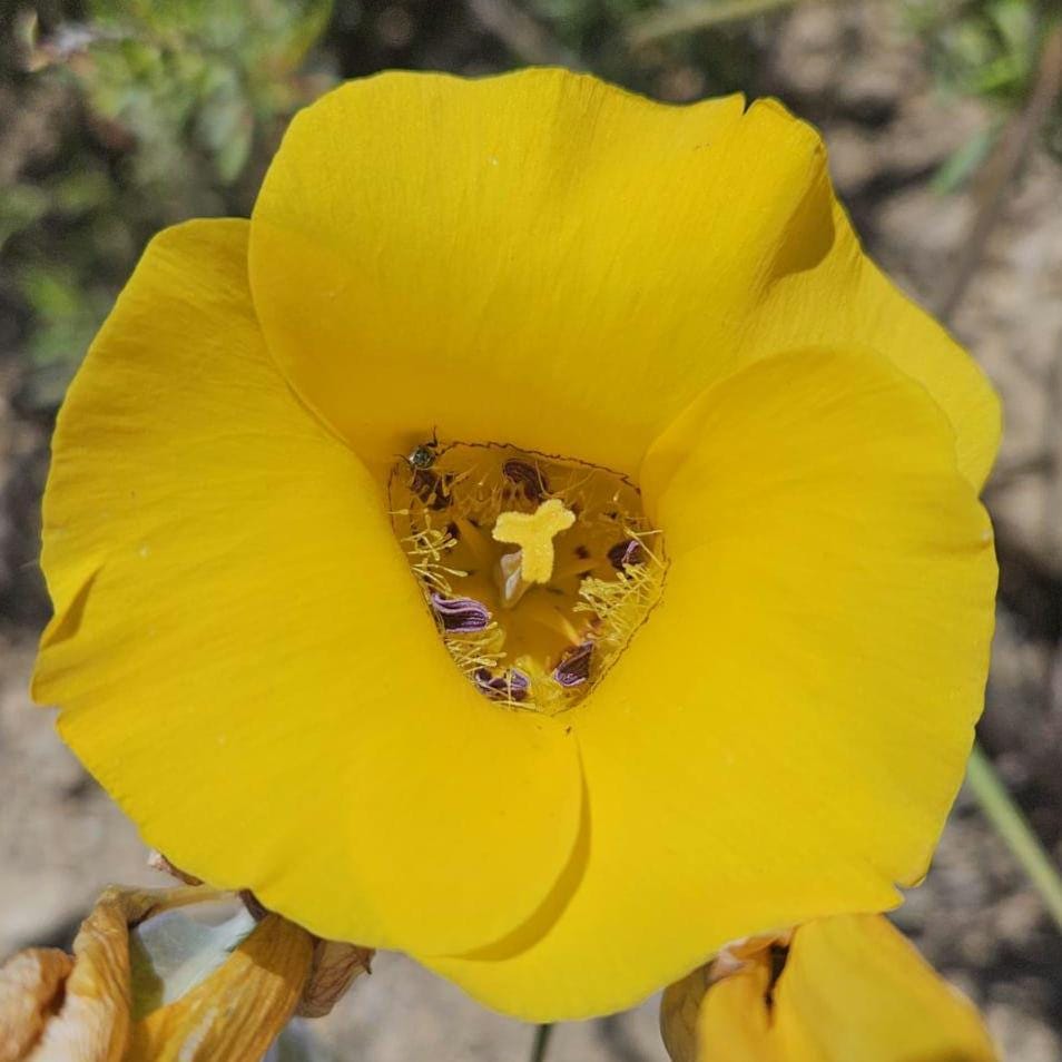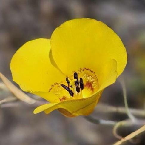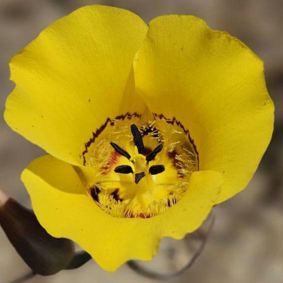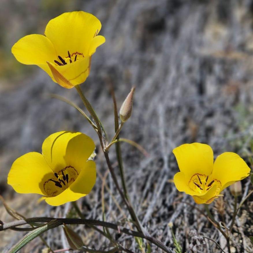 Calochortus clavatus is a species of mariposa lily known by the common name clubhair mariposa lily. It is endemic to California where it is found in forests and on chaparral slopes. This lily produces tall stems up to a meter in height and only basal leaves. Atop the stem is a lily bloom with sepals up to 4 centimeters long. The petals are up to 5 centimeters long and yellow with a darker line or series of bands near the base, which are often red. The cup of the flower is filled with hairs which have clubbed ends. The anthers are often deep purple. The capsule fruit is up to 9 centimeters long.
